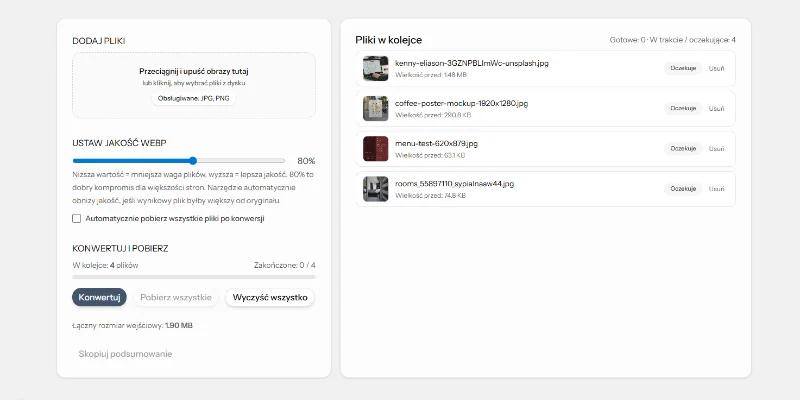 Dodaj pliki po lewej stronie, aby rozpocząć konwersję JPG/PNG na WebP.